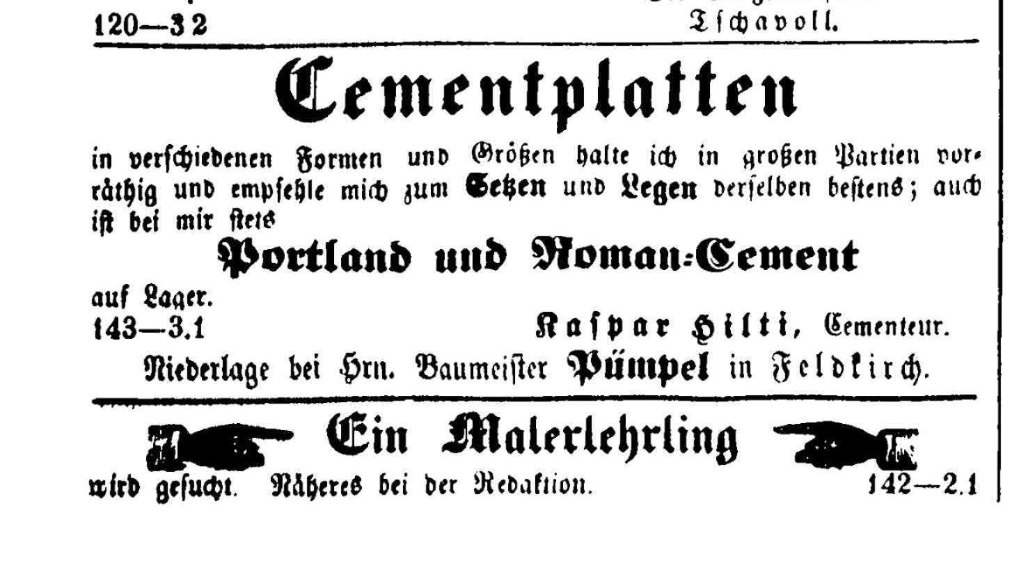 Als Caspar Hilti 1875 in Feldkirch sein Gewerbe für die Herstellung von „Cementtafeln“ anmeldete, traf er damit einen günstigen Zeitpunkt. Seit drei Jahren fuhr die Eisenbahn zwischen Bregenz und Bludenz. Feldkirch lag verkehrsgünstig an der Strecke, die neue Bahnlinie brachte der Stadt einen spürbaren Aufschwung. So wuchs die Nachfrage nach Baustoffen. Und mit Zement stand ein neuer Werkstoff zur Verfügung, der vielseitig verwendbar war.