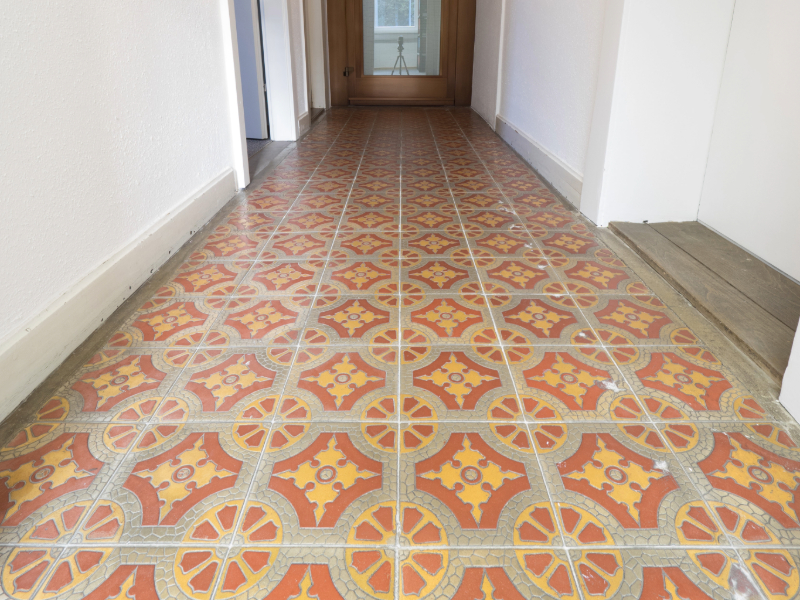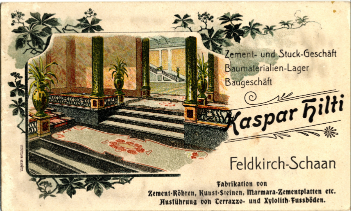 Wie sicher Caspar Hilti im Umgang mit diesem Material war, zeigt sich auch an einem anderen Produkt: den sogenannten Terrazzo-Böden. Sie wurden vor Ort aus einer Zementmasse hergestellt, mit Marmor- oder Granitstücken versetzt, geschliffen und abschließend poliert. Im Gegensatz zu den reinen Zementwaren waren sie kein fertiges Produkt, das verlegt wurde, sondern entstanden direkt vor Ort. Schicht für Schicht, bis zur glatt polierten Oberfläche und individuell angepasst an jede Grundfläche. Bis heute haben sich diese einzigartigen Bodenbeläge in so manchem Gründerzeithaus erhalten – unter anderem auch im Firmensitz von Hilti & Jehle in Feldkirch.